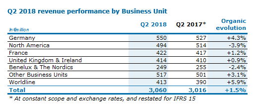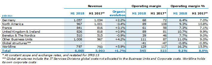 During the first half of 2018, revenue grew in most of the Business Units. In particular, revenue growth in Germany was driven by the ramp-up of new B&PS projects, notably in the public sector, and from additional BDS activity compensating for the base effect of two large IDM Transition & Transformation phases completed last year. In France, growth was fueled by IDM thanks to several contract ramp-ups and B&PS benefitting from new projects in Public Sector and Financial Services. United Kingdom & Ireland grew in a complex environment thanks to the ramp-up of new IDM contracts, notably in Financial Services, which more than offset the partial re-insourcing of the BBC contract. Other Business Units positively contributed to the revenue evolution of all Divisions, mainly thanks to Central & Eastern Europe, Asia-Pacific, Iberia, and South America. Worldline recorded a strong performance in all its businesses as detailed above.