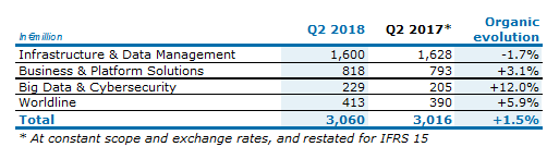 New contracts in Q2 benefitted to IDM thanks to a strong commercial dynamism in particular in North America with the signature of contracts in Orchestrated Hybrid Cloud and Digital Workplace in Financial Services or for Industry 4.0. Still in IDM, the UK signed a large Robotic Process Automation (RPA) contract in the public sector. Germany signed new large multi-Divisions contracts such as with Siemens or in the aerospace industry. Worldline signed a major partnership contract with Commerzbank in Q2.