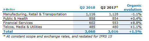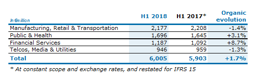 Thierry Breton, Chairman and CEO said: “During the first half of the year we confirmed a strong commercial dynamic consolidating our strategy to accompany our customers all along their digital transformation. By leveraging the strengths of all our Divisions in our Digital Transformation Factory, we signed very large transformation contracts translating in a strong book to bill ratio in each Division and 117% for the Group. The commercial activity was particularly high in North America in Q2 with a book to bill ratio at 190%. In the meantime we continued to closely monitor our operational efficiency, improving the Group profitability and increasing EPS by circa 8 %. In this context, we confirm all our objectives for 2018 towards our 2019 Ambition.