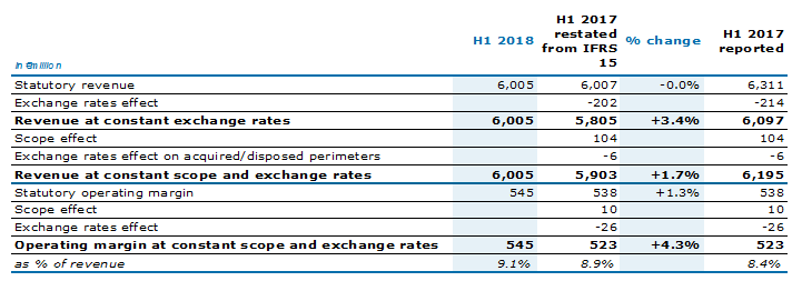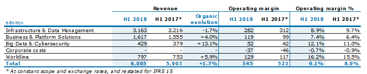 Revenue was € 6,005 million, up +3.4% at constant exchange rates restated from IFRS 15 and +1.7% organically, deriving from the demand of large organizations implementing their digital transformation. This particularly benefitted to Business & Platform Solutions, Big Data & Cybersecurity, and Worldline. The Group grew by +2.8% excluding North America which is expected to go back to growth by year-end. Operating margin was € 545 million, representing 9.1% of revenue.