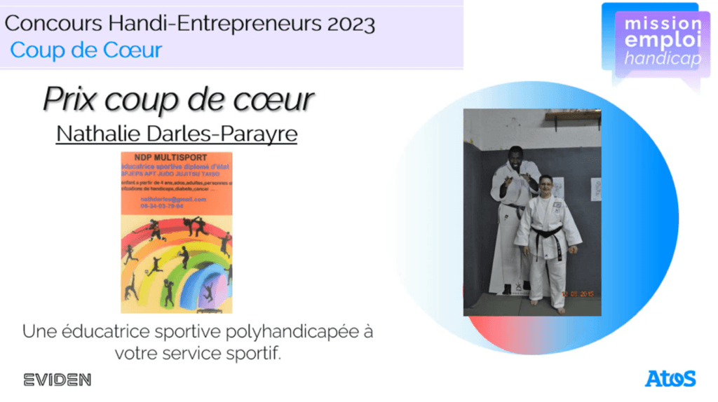 Le Jury a également décerné un prix « Coup de cœur 2023 » (500 €) : A Nathalie DARLES-PARAYRE pour son initiative « Une éducatrice sportive polyhandicapée à votre service sportif ».